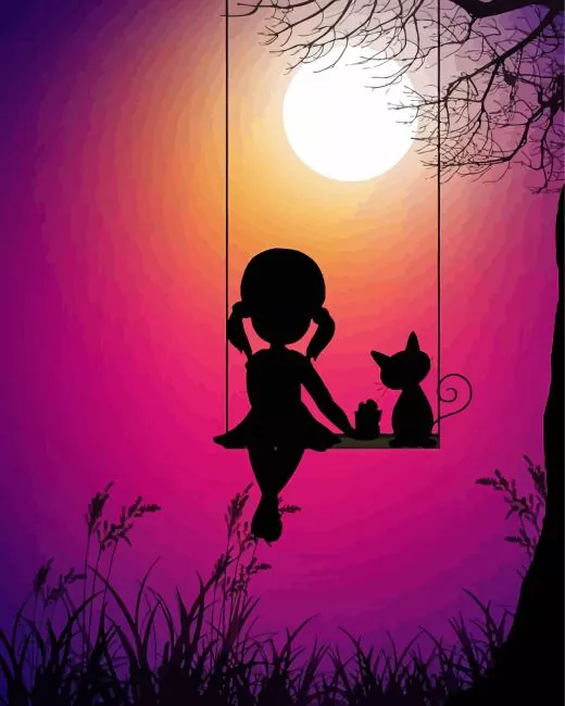 Cat And Girl Silhouette At Sunset Diamond Painting